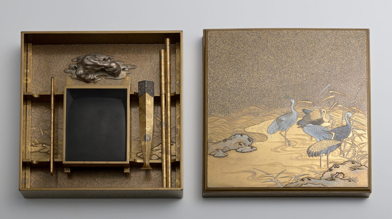 和歌川の河口に広がる干潟を中心に形成された景勝地・和歌浦(和歌山県和歌山市)をあらわした硯箱と文台です。絵柄を盛り上げて立体的にあらわす高蒔絵など様々な蒔絵技法を用いて、和歌浦の象徴的な景物を装飾的にあらわしています。奈良時代の歌人・山部赤人(やまべのあかひと、生没年不詳)が詠んだ和歌「若の浦に 潮満ち来れば 潟をなみ 葦辺をさして 鶴鳴き渡る」より、葦が群生する水辺に鶴たちが集うモティーフが用いられています。