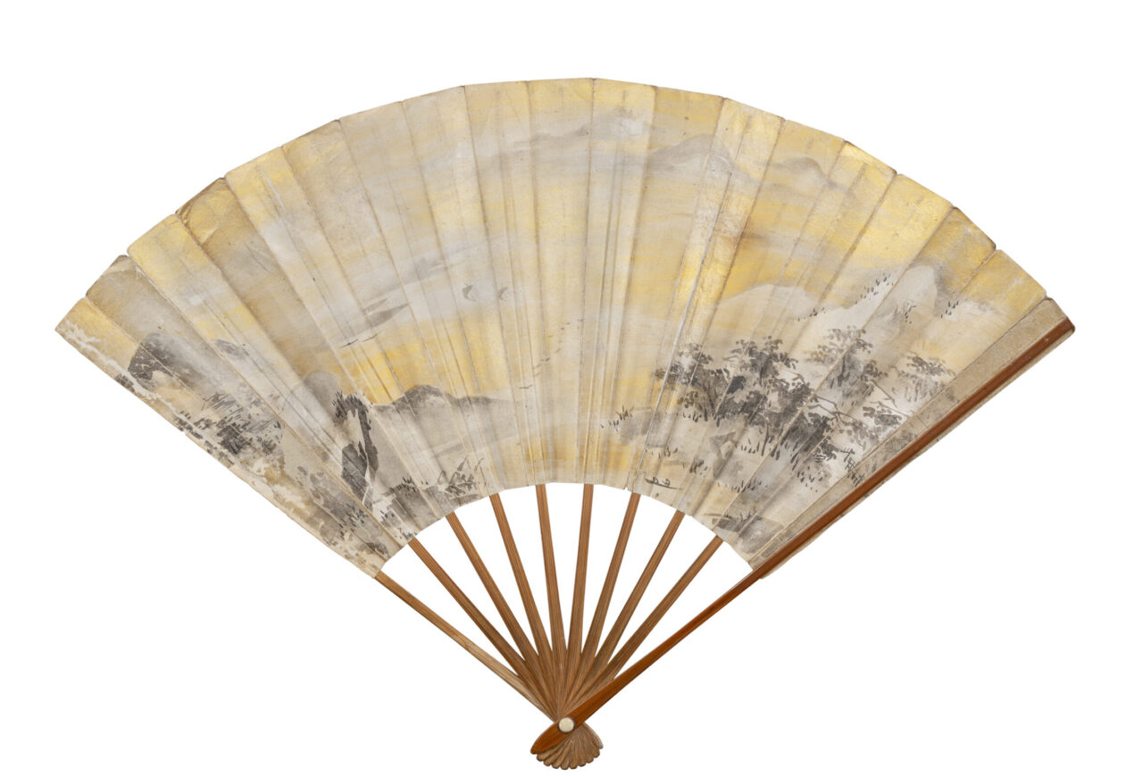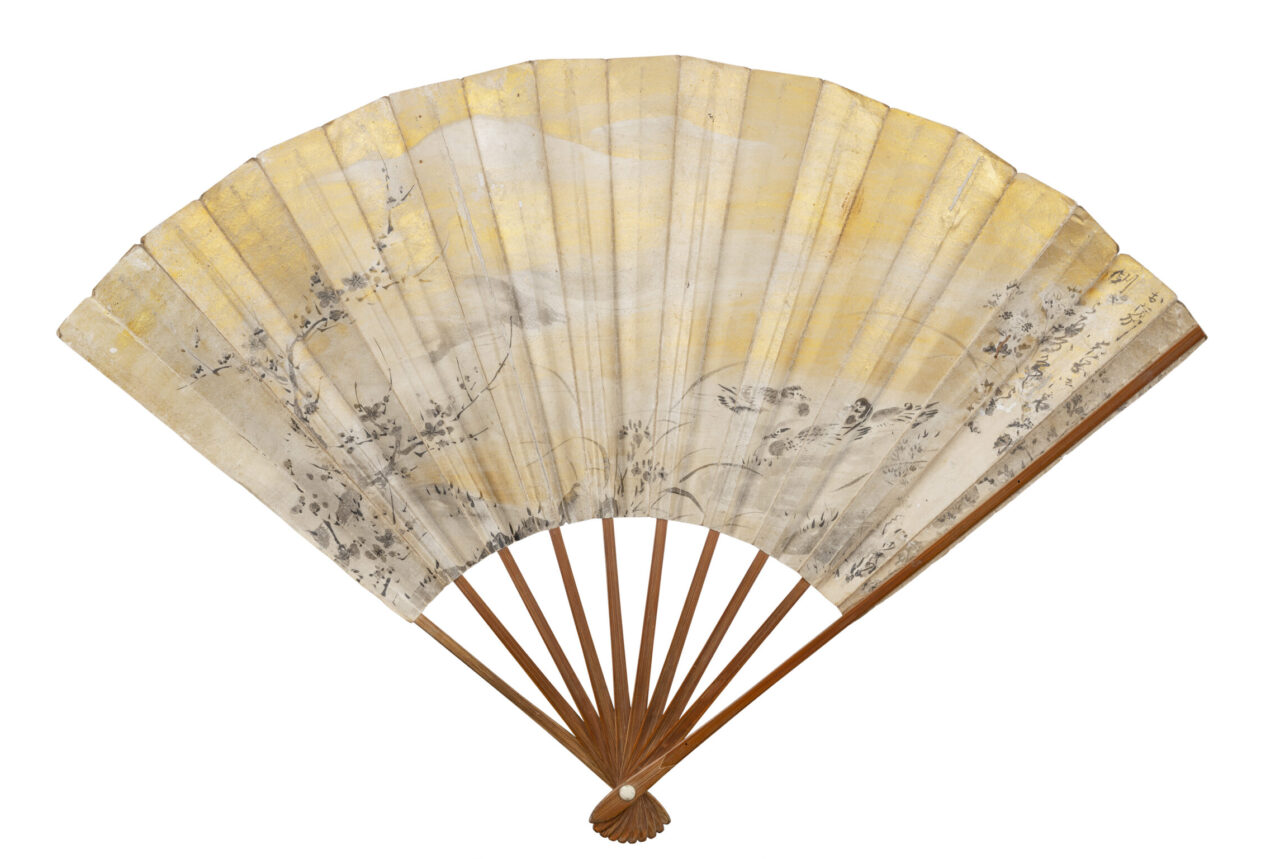 薄く金泥をほどこした扇面の表裏に、狩野永徳(1543~1590)がそれぞれのモティーフを水墨で描きました。「梅花水禽図」面は、水辺を泳ぐ三羽の鴨の背景に、梅、菖蒲、菊、萩など四季折々の花々とはるか遠くを望む雪山を描いています。「遠浦帰帆図」面は、中国・湖南省の洞庭湖周辺を表した瀟湘八景をのびやかで素早い筆致であらわしています。書付より、豊臣秀吉(1537~1598)が三輪加賀守元徳(みわかがのかみもとのり、生没年不詳)に下賜した扇と伝わります。