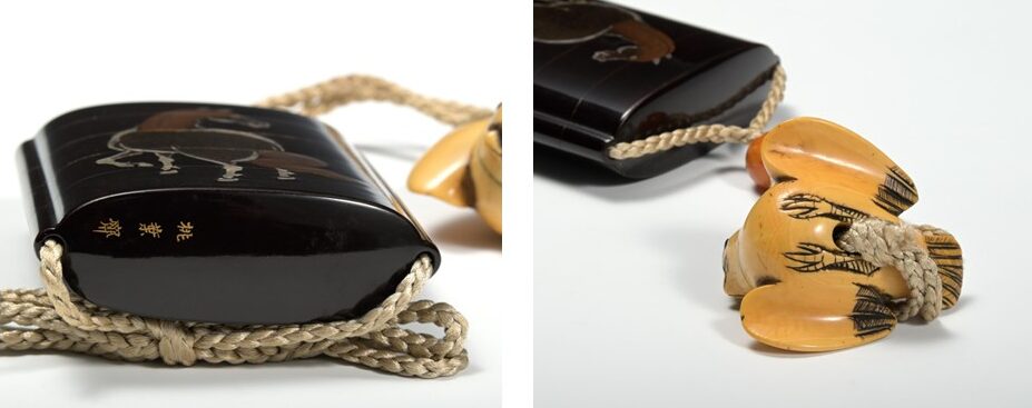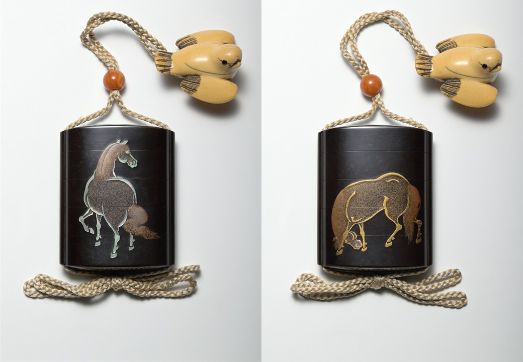 黒漆地に草をはむ姿と見返り姿の馬があらわされています。たてがみと尾に平蒔絵、体全体には金梨子地(きんなしじ)をほどこし、それぞれ金と螺鈿(らでん)で輪郭線をあらわしています。飯塚桃葉(?~1790)は、阿波国(あわのくに)徳島藩主・蜂須賀重喜(はちすかしげよし)に重用され、印籠のほか硯箱、箪笥(たんす)、鞍などの調度品を多数制作しました。