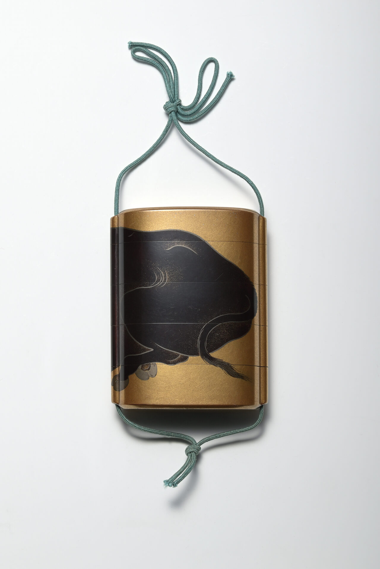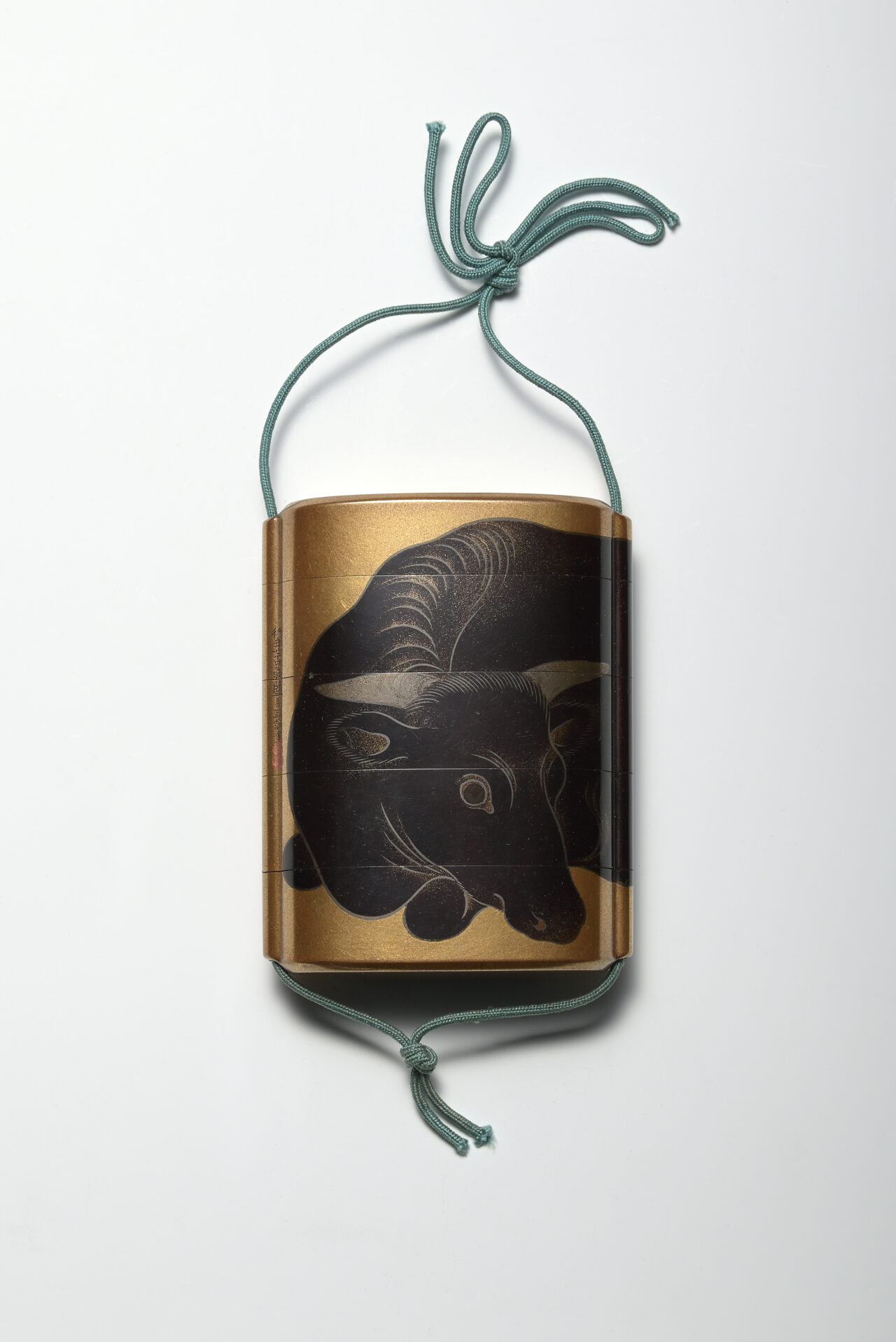 金粉を敷きつめるように蒔いた沃懸地(いかけじ)に、大きな1頭の黒牛が両面にわたって横たわる様子を大胆な構図であらわしています。塩見政誠(?~1723)は、京都で活躍した蒔絵師で、研出蒔絵(とぎだしまきえ)を得意とし、印籠や硯箱などを多く手がけました。