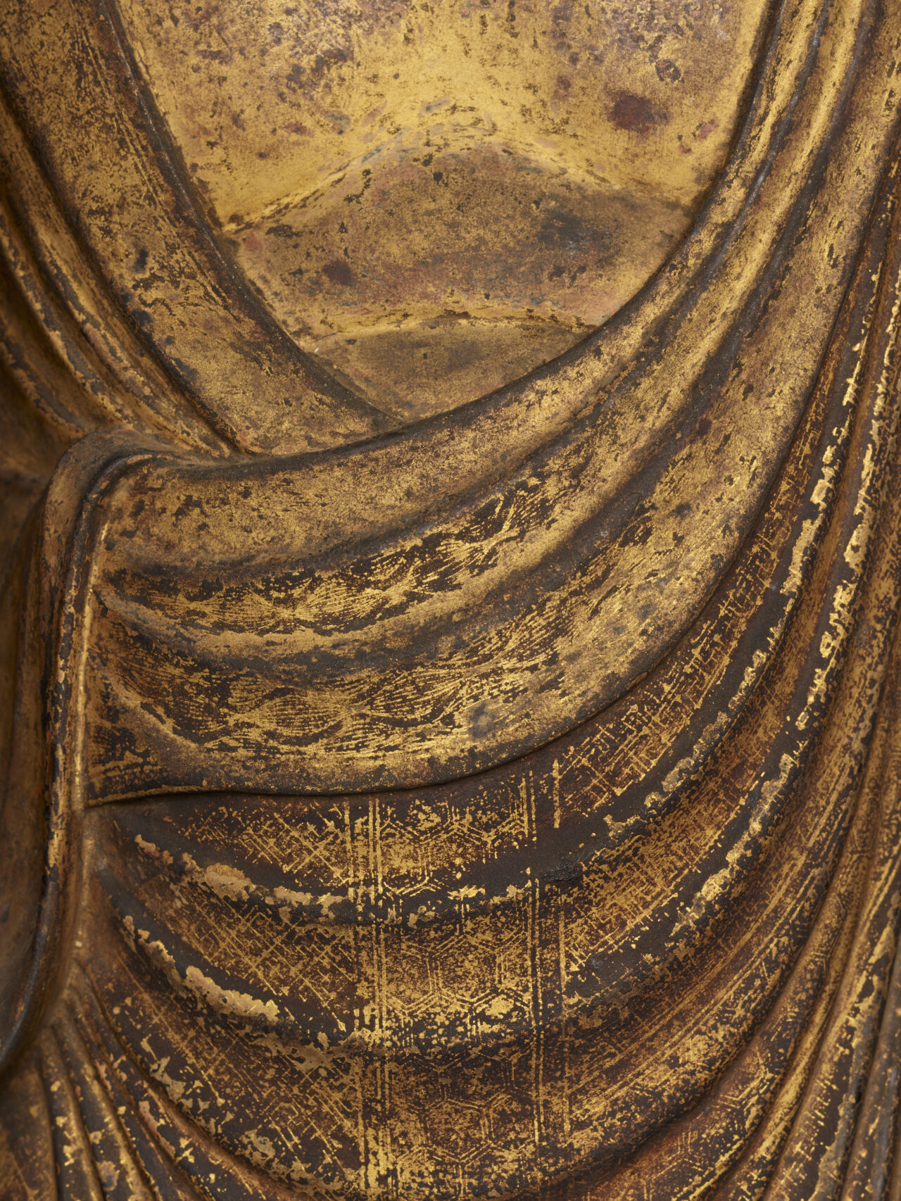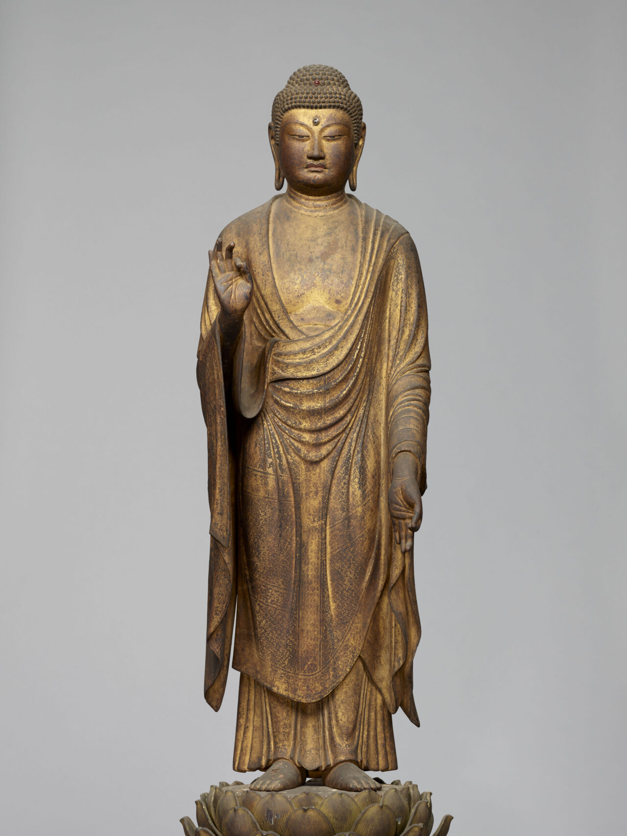 像高約97.5cmの来迎印を結ぶ阿弥陀如来立像です。頭部は針葉樹材による一木造(いちぼくつくり)、身体部分は複数の木材を用いた寄木造(よせぎづくり)です。玉眼(ぎょくがん)をほどこした両目、やや面長な顔立ち、胸前の衣をU字のように合わせる表現は、慶派(けいは)仏師・快慶(生没年不詳)の作風「安阿弥様(あんなみよう)」の特徴を示しています。阿弥陀仏は西方(さいほう)極楽浄土をおさめて死者を浄土へ導く存在とされ、浄土信仰の流行にともなって像高約90センチメートル前後(3尺)の立像であらわされた「三尺阿弥陀(さんじゃくあみだ)」が多く制作されました。