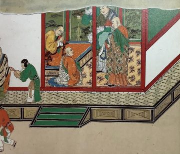 絵巻などにも描かれていて、鎌倉時代(14世紀)の玄奘三蔵絵にもありますが、これは天板が湾曲するタイプのものです。