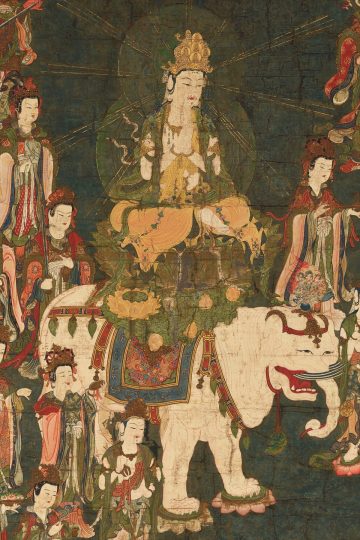 法華経を信仰する修行者を守る仏で、この絵のように6本の牙を持つ白い象、「六牙(ろくげ)の白象(びゃくぞう)」に乗って表現されます。普賢菩薩の行を象徴しているのが象と言われています。