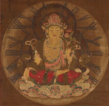 体や衣は均一な太さの線で描き、蓮台や衣は白を混ぜた中間色で彩色されています。銀を多用した光背や菩薩を囲む円相の下に広がる山や川の風景などに、製作年代よりも古い平安時代末の雰囲気が見られる作品です。