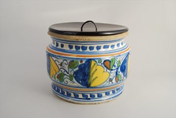 アルバレロと呼ばれる形で、器の上下にくびれのあるのが特徴です。本来は、もう少し細長い(竹筒形)ものが多いのですが、ヨーロッパの薬壺です。液体の薬を入れてコルクで栓をして使います。