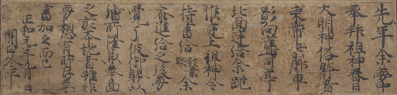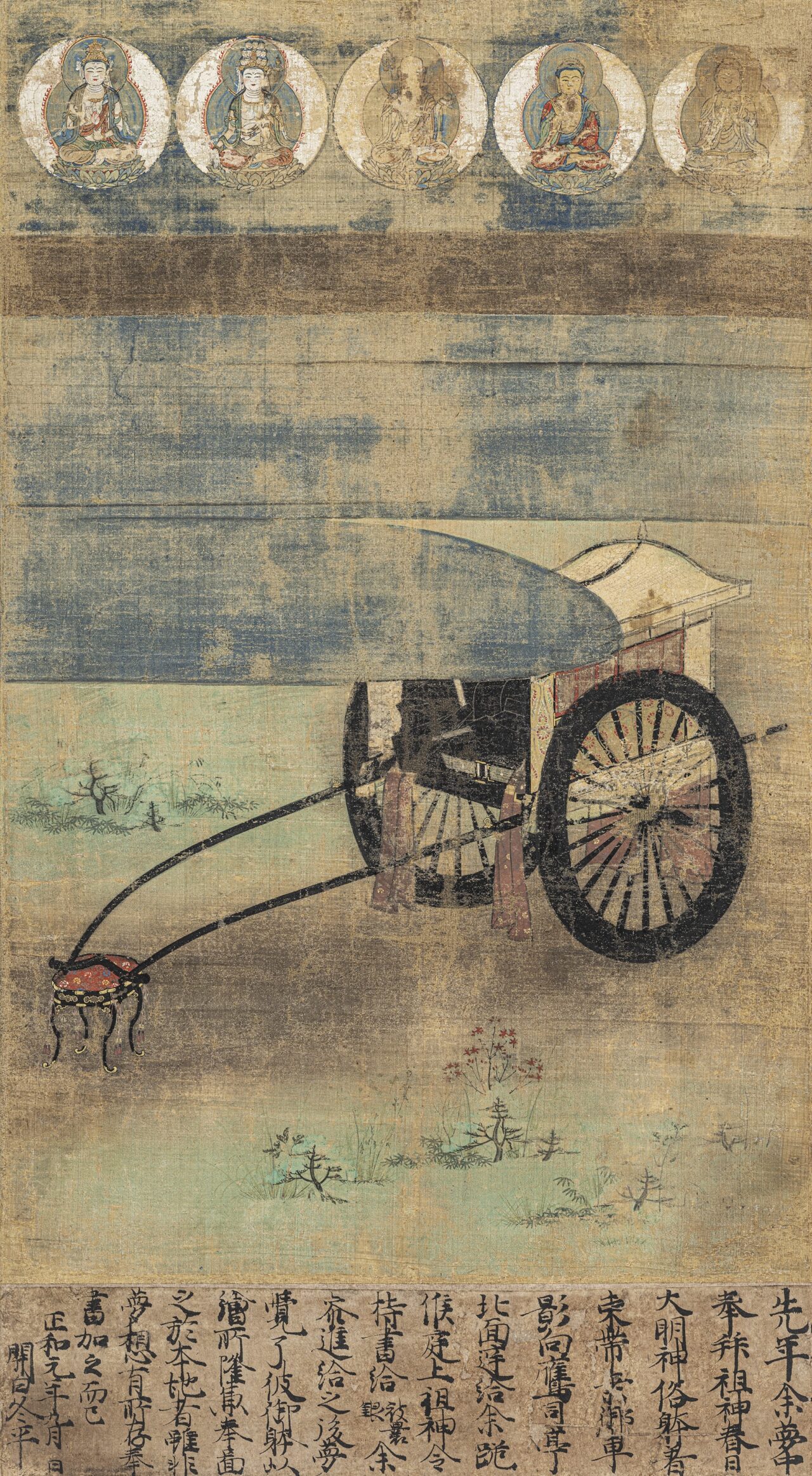 この絵の下部に文章があり、この絵を制作するに至った経緯が記されています。ちなみに文章を書いたのは、この絵の制作を依頼した注文主・鷹司冬平(たかつかさふゆひら、1275~1327)です。それによると、先年夢の中で、御車に乗った束帯(そくたい)姿の春日明神が自邸の北側の庭に現れたので、その姿を拝してひざまずくと、銀色の袋に包まれた書を手渡されたところで目が覚めた、という内容です。さらに、夢の中で見た春日明神のお姿を高階隆兼に描かせた、とあります。