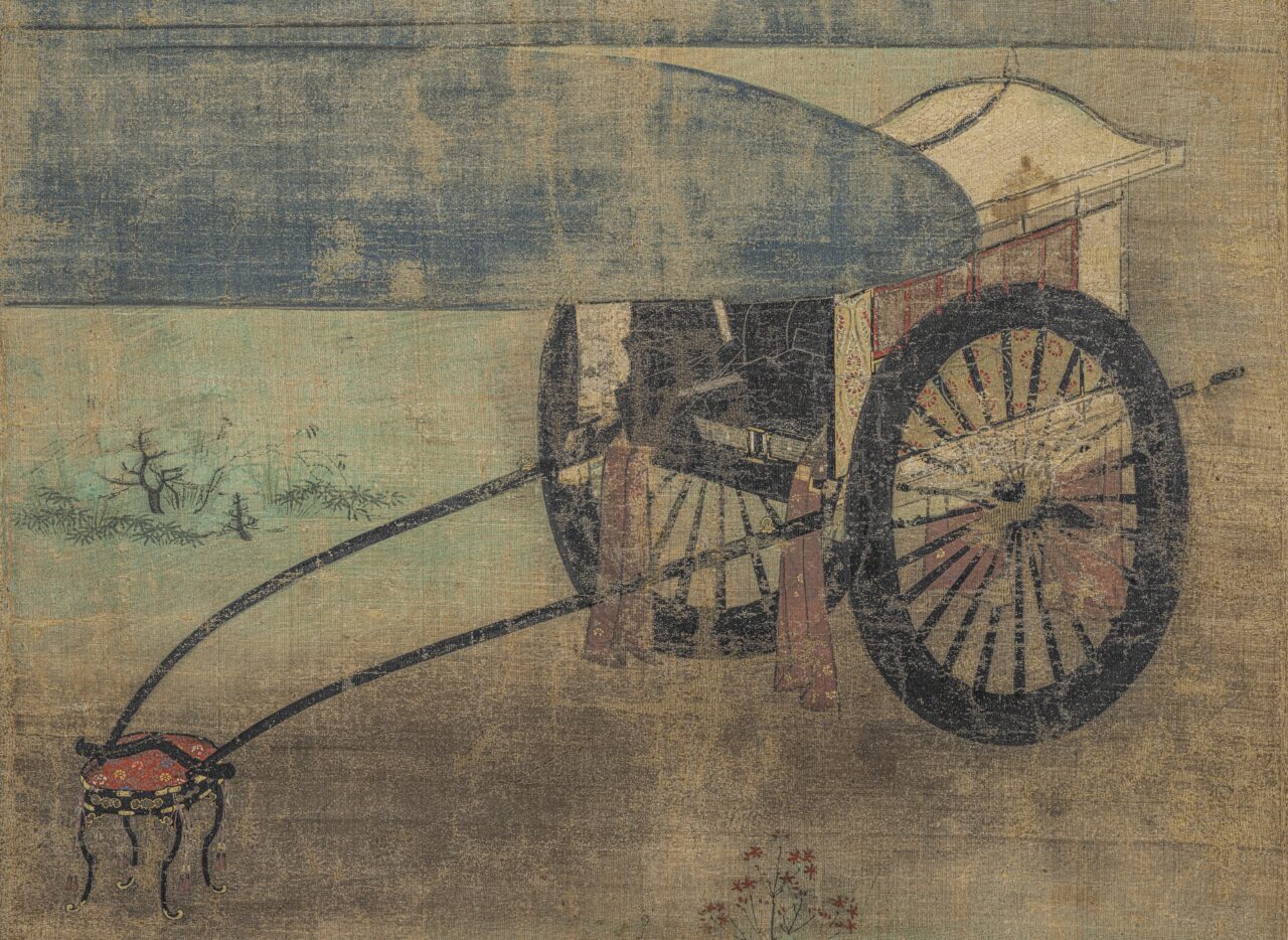 はい、ここに牛は描かれていませんが、牛が引くスタイルの御所車(ごしょぐるま)、いわゆる牛車です。実は、乗る人物の位階・階級によって少しずつ仕様が違うんです。これは御所車の中でも、最も格式が高く豪華な「唐車(からくるま)」といい、上皇・皇后・東宮・親王などの皇族や摂政・関白などの最上位の貴族が用いる車でした。