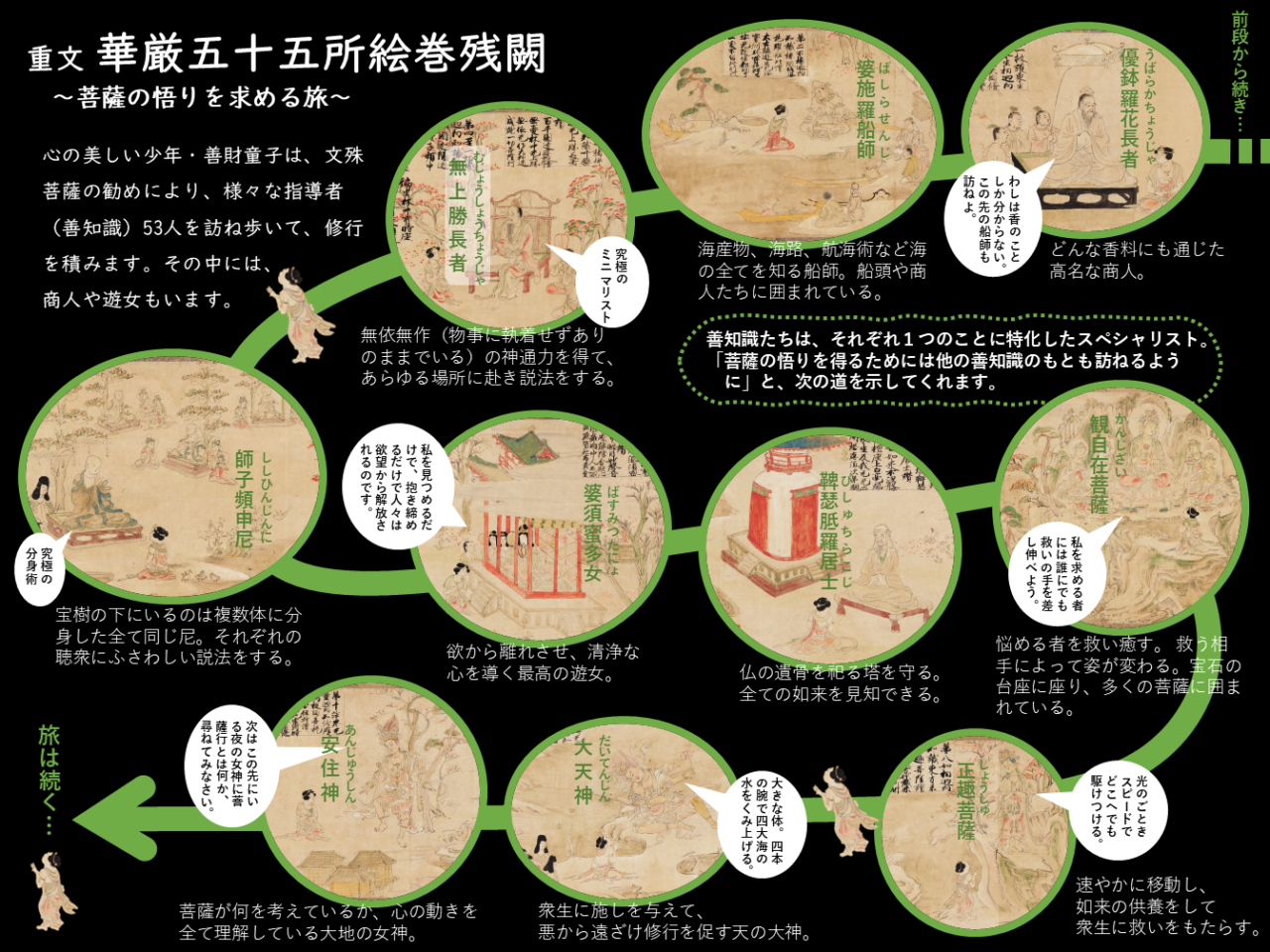 55の場面という意味です。説話のあらすじは、善財童子(ぜんざいどうじ)という少年が、53人の教え導いてくれる師(善知識)のもとを巡るというもの。文殊菩薩(もんじゅぼさつ)に始まり、最後に普賢菩薩(ふげんぼさつ)へと至る、合計55の場面から成っています。