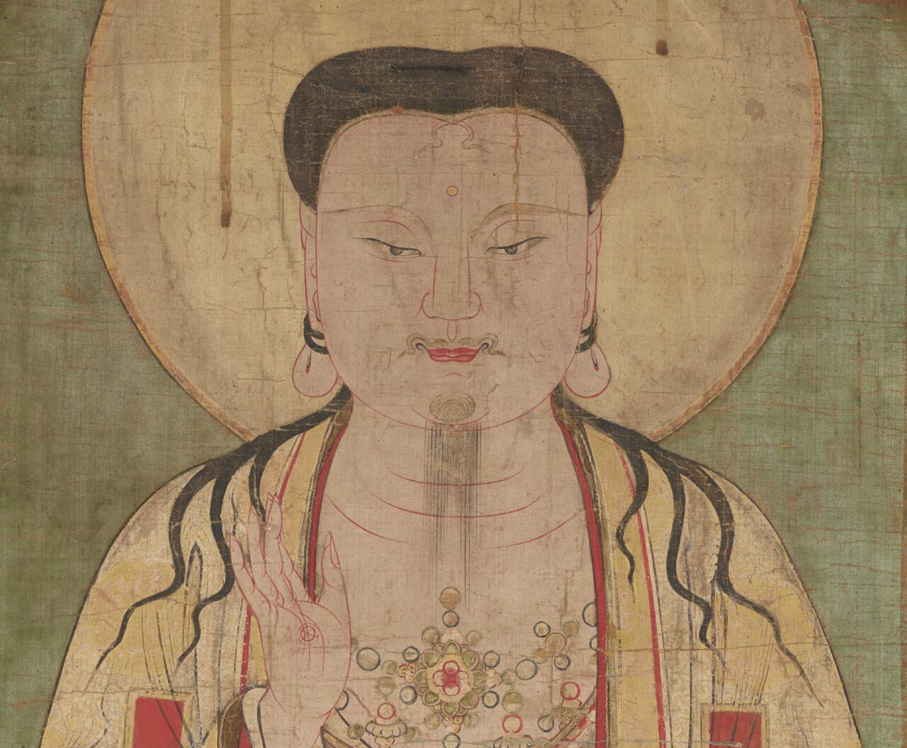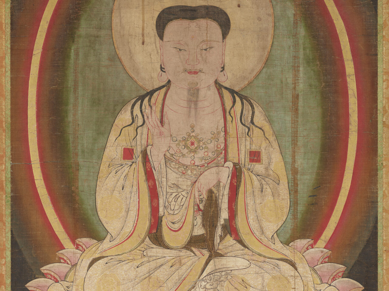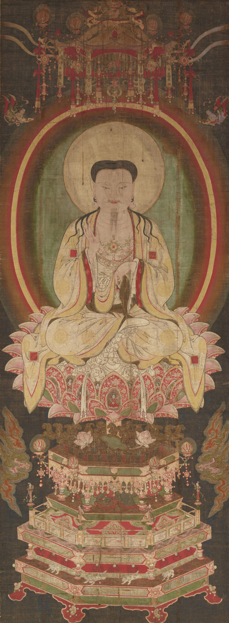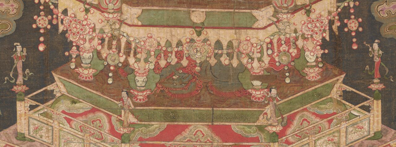 影響というよりも、布教のため能動的に取り入れたと言うほうが正しいですね。マニ教は本来は、仏教よりもキリスト教の考えをかなり重要視した宗教でした。ただ、最も長く信仰されたのは仏教圏である中国で、特に江南地方では、邪教として弾圧されながらも秘密裡に生き残り、仏画の工房で仏画に似せたマニ教の絵を描かせていたと考えられています。この絵はそのうちの1つですから、仏教要素を特に強く感じるわけです。