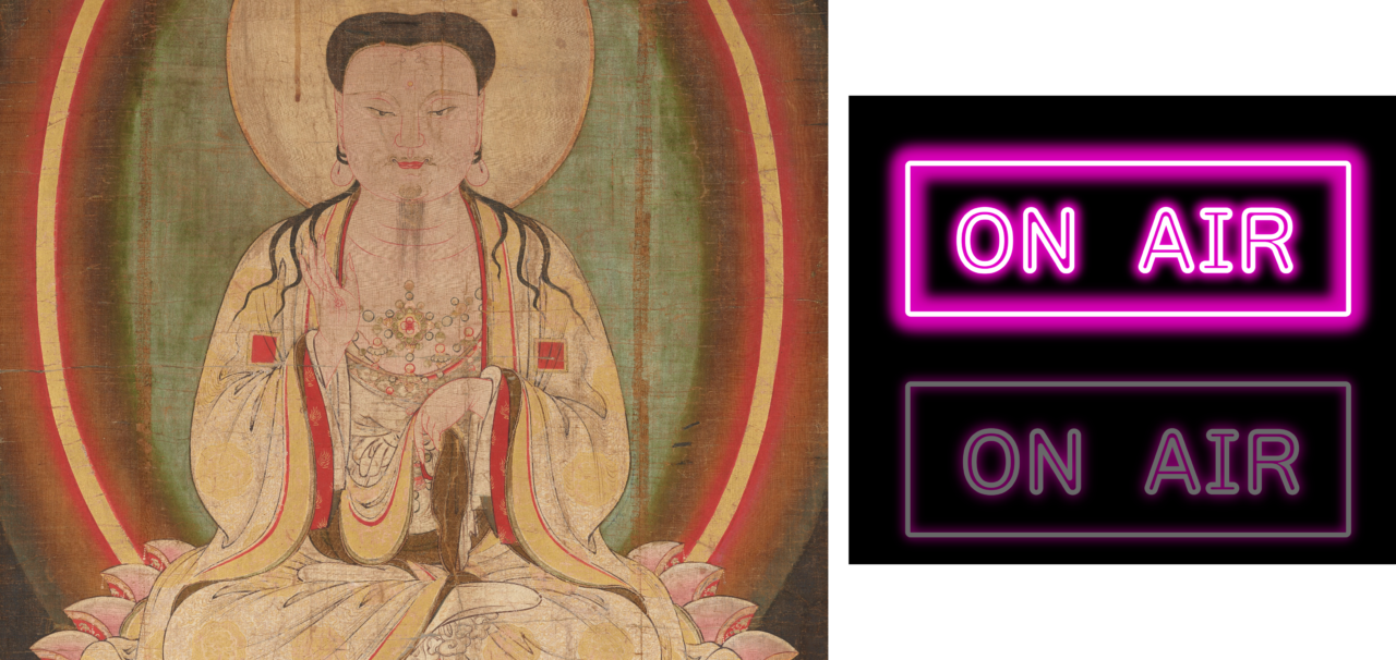 この輪は光背(こうはい)といって、神仏の発する聖なる光を視覚化したものです。白っぽい光の管のような太い線は金で描かれていて、その周りを赤から茶色のグラデーションで囲んでいます。まるでネオンサインのような輝きの表現、見事ですよね。