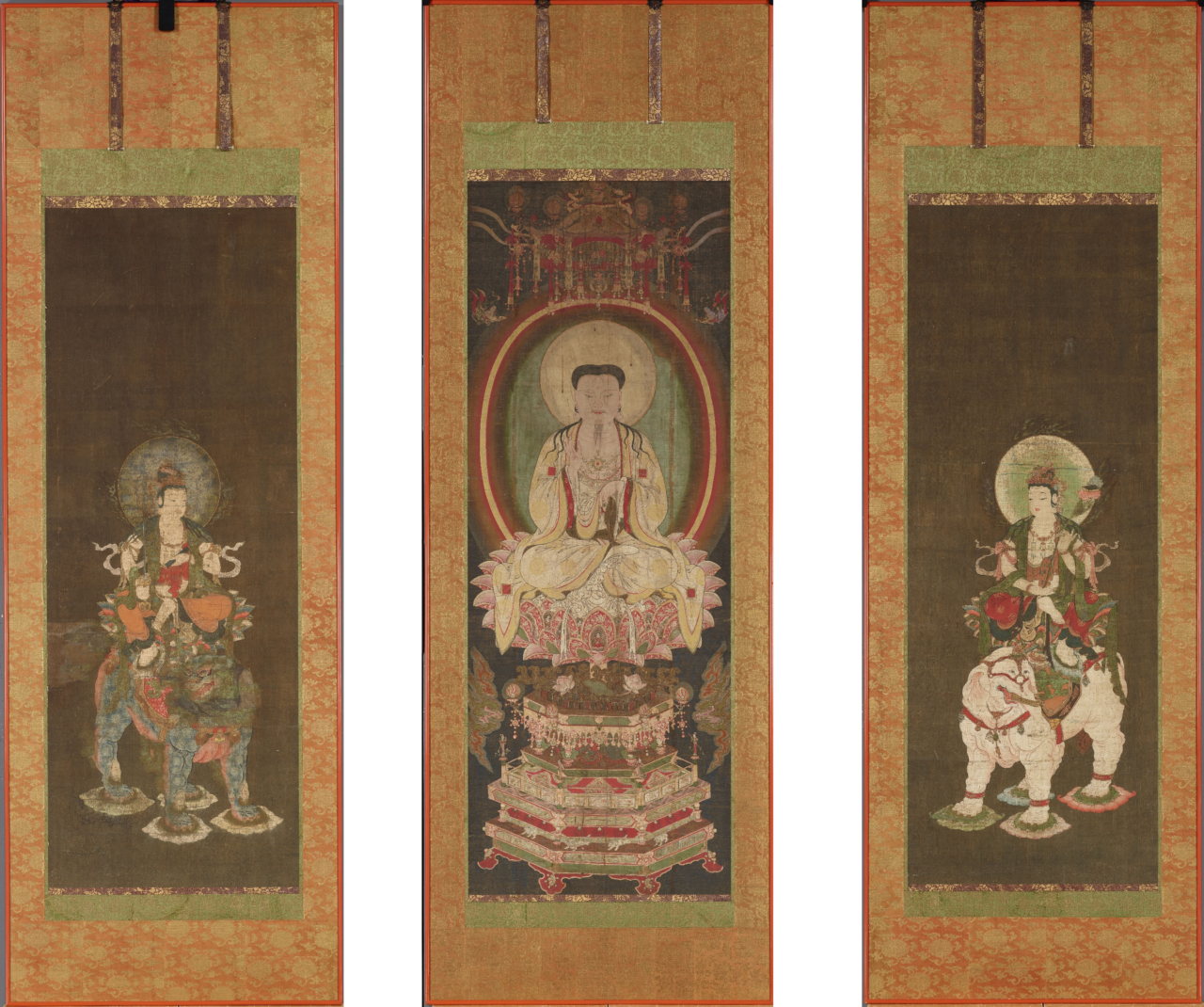 中央幅は地蔵菩薩と伝わりますが、近年の研究によりメソポタミアに生まれたマニ(216~276?)を描いたものと判明しました。彼が現在のイラン付近で起こしたマニ教はササン朝のシャープール1世に保護され、その後ユーラシア大陸一帯に広まり信仰されました。両肩と両膝のあたりにつけるセグメンタと呼ばれる赤い四角形や、肩に垂れる髪などがマニ像の特徴です。台座の描き方など仏教絵画の影響を強く受けている部分も見られます。中国において元・明時代頃に描かれたマニ教絵画が仏画として日本に伝わりましたが、この絵もそのうちの1つと考えられます。左の文殊菩薩は獅子に、右の普賢菩薩は象に乗り、ともに穏やかな表情をしています。左右の二幅は室町時代に日本で描かれたと考えられますが、いつしか中央幅にマニ像を配して三幅対とされたようです。
