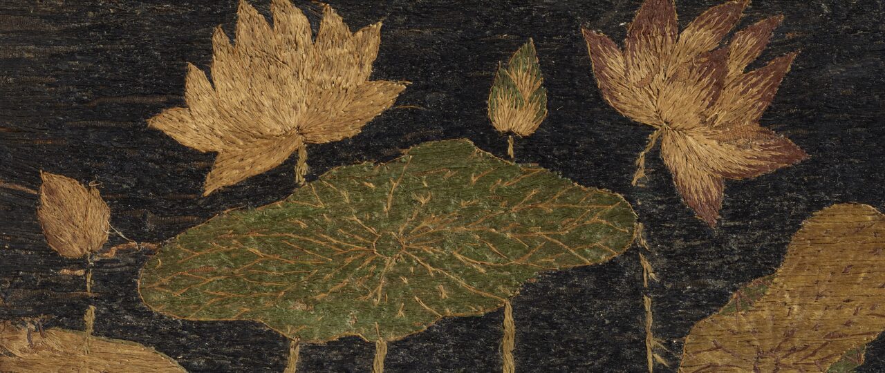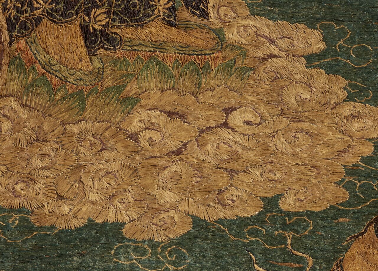 この作品については誰が作ったかあるいは誰が注文したかはわかりません。ただ、現存している繍仏作品を概観してみると、女性が注文主である場合が多いようです。故人の追善供養のためであったり、生前から死後の極楽往生のために願ったりしています。