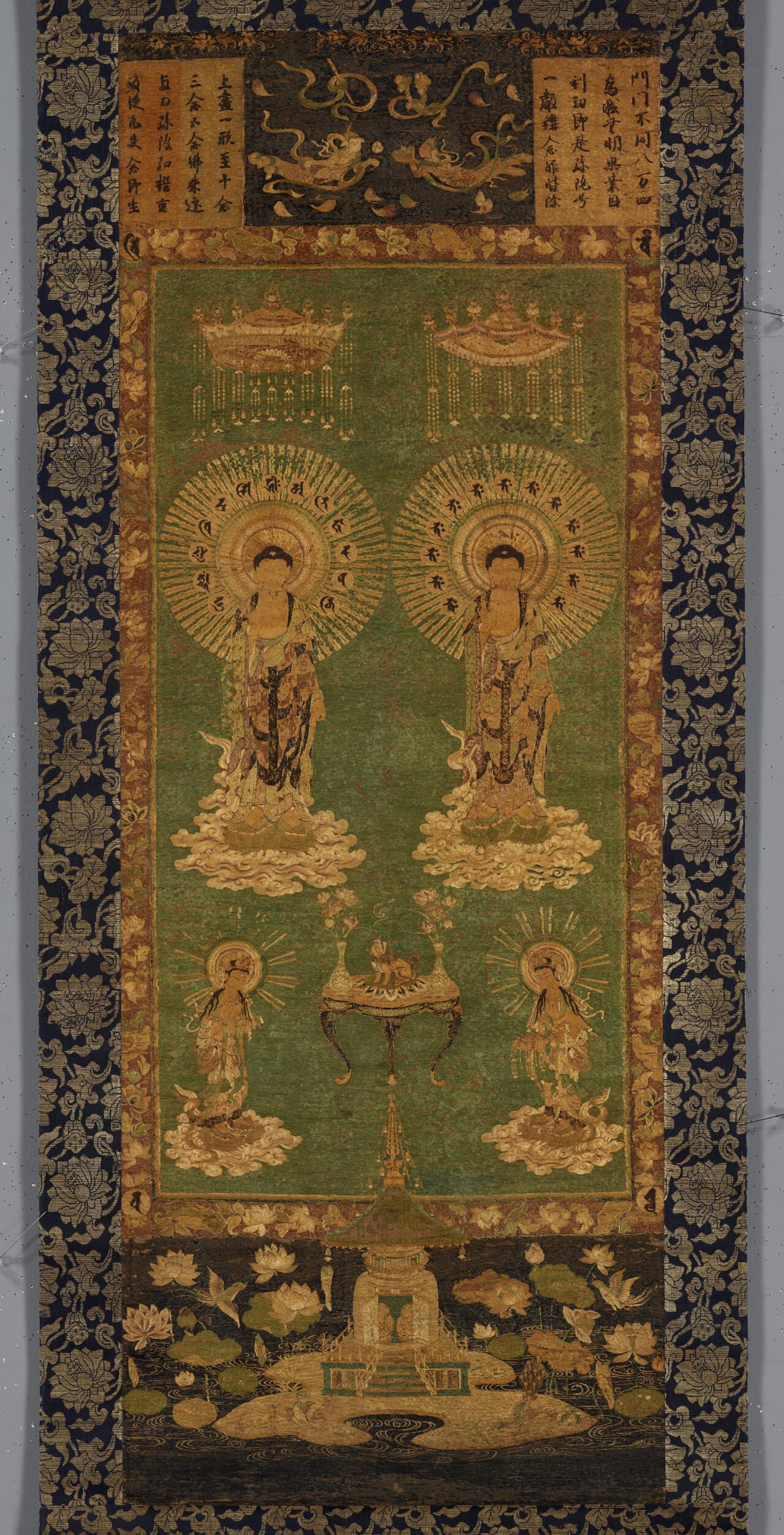阿弥陀如来と観音菩薩・勢至菩薩が雲に乗って飛来し、死者の魂を極楽浄土に連れていくために迎えに来た来迎図。表具全体に精緻な刺繍をほどこす総繍(そうぬい)であらわす。阿弥陀の螺髪(らほつ)や、仏たちが身にまとう衣は、人の髪の毛を用いる髪繍(はっしゅう)がほどこされている。