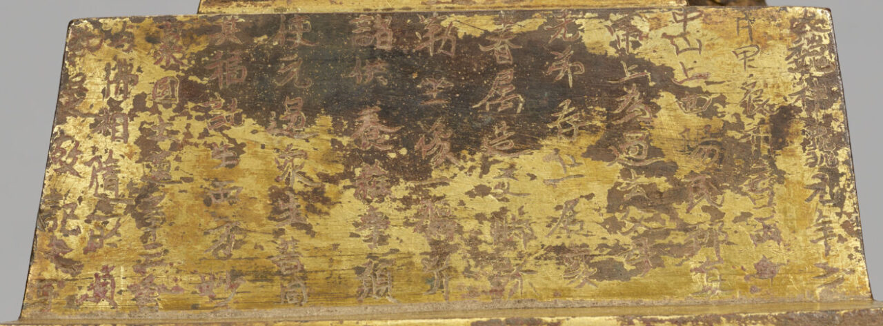 中国の北魏で西暦500年代に作られたと考えられています。台の背面に文章(銘文)が刻まれており、ここには制作年である「大魏神亀元年三月」(西暦518年)と制作地「曲陽」(現在の河北省にある地名)の文字が見えます。ただ、台と像がはじめからセットだったかは分かりません。
