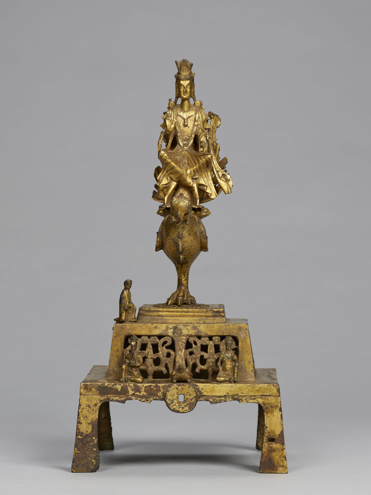 実は、それもわかっていません。そもそも、鳥に乗っている菩薩は珍しいんですね。孔雀明王というのはいるんですが、孔雀でもないですし。しかも、台と同様に、この像が初めから鳥に乗っていたのかも不明です。